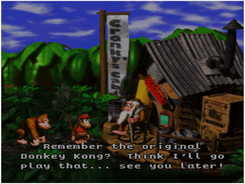 Cranky Kong, em alguns momentos, diz o seguinte em sua cabana, em tradução livre: “Você se lembra do Donkey Kong original? Acho que eu vou jogar ele… vejo vocês depois”.